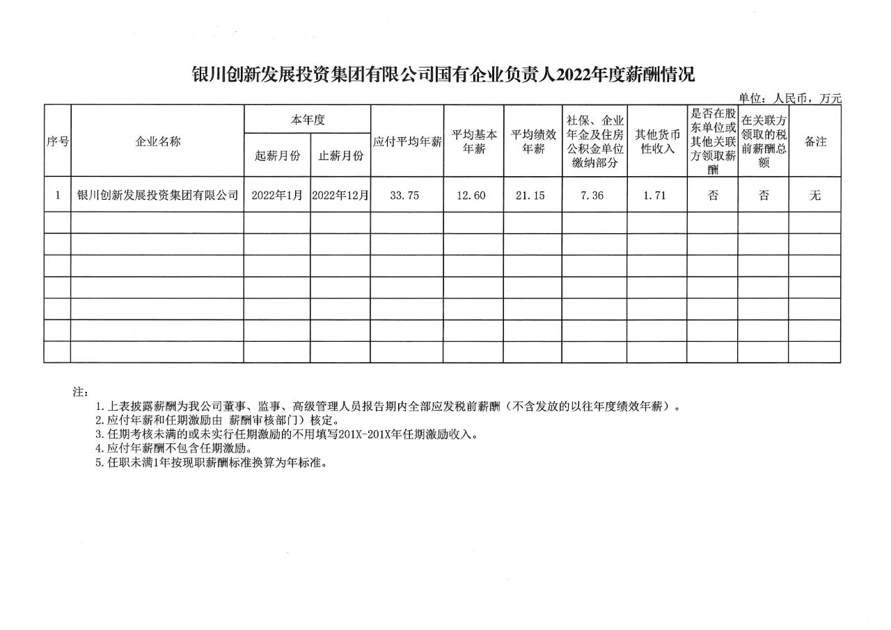 根據(jù)《銀川市屬國有企業(yè)負(fù)責(zé)人薪酬管理辦法(試行)》(銀國資發(fā)〔2021〕458號)、《銀川市屬國有企業(yè)負(fù)責(zé)人經(jīng)營業(yè)績考核辦法(試行)》(銀國資發(fā)〔2021〕459號)、《銀川市屬國有企業(yè)負(fù)責(zé)人經(jīng)營業(yè)績考核實施細(xì)則(試行)》規(guī)定,經(jīng)銀川市國資委核定,現(xiàn)將銀川創(chuàng)新發(fā)展投資集團(tuán)有限公司企業(yè)負(fù)責(zé)人2022年度薪酬信息予以披露。